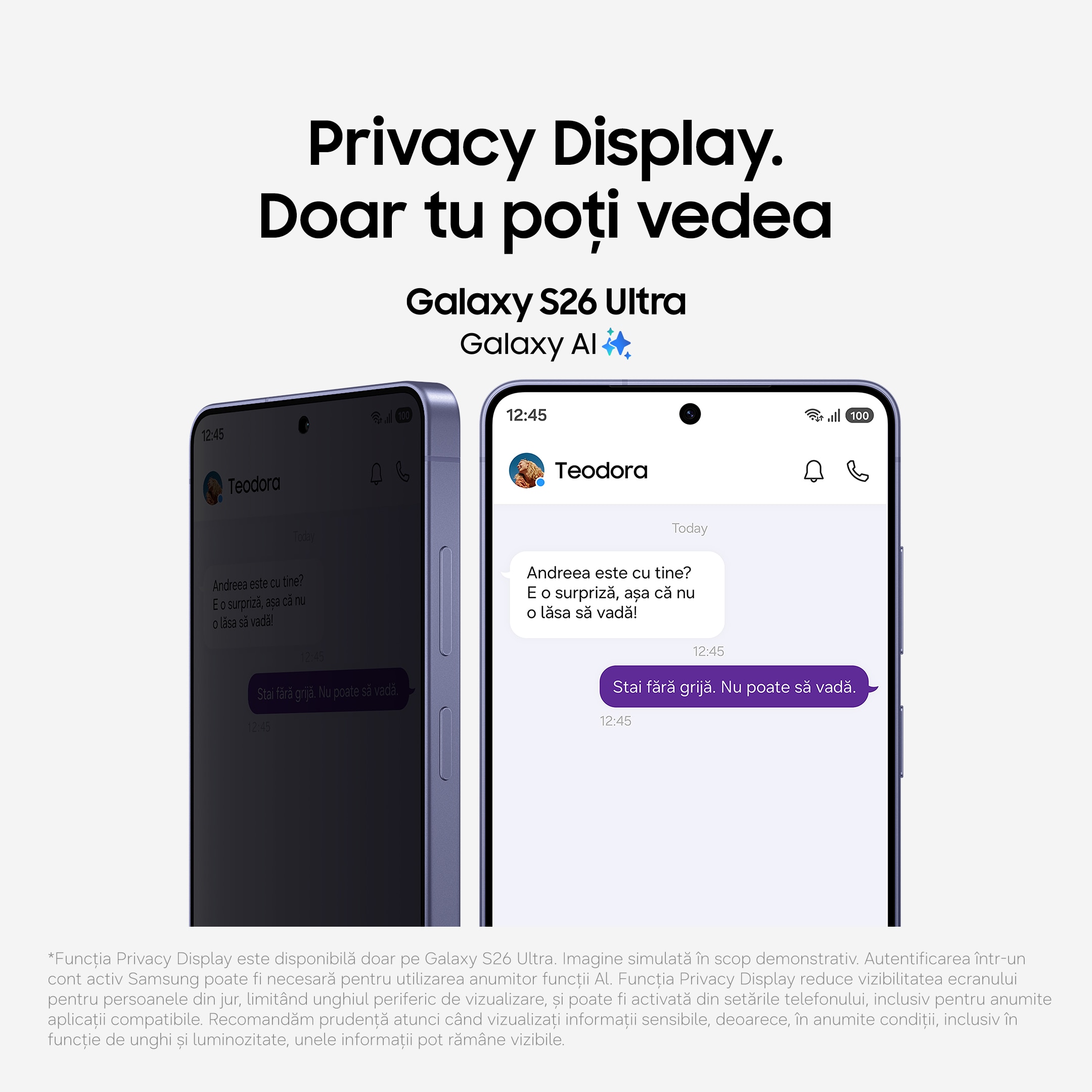 Fa cunostinta cu ecranul tau Privacy integrat, doar pe Galaxy S26 Ultra. Activeaza-l manual, iar ecranul Privacy foloseste tehnologie inovatoare pentru a-ti proteja informatiile private, ascunzand intregul ecran din campul vizual al celorlalti. Sau poti alege ce vrei sa ascunzi, precum anumite aplicatii, toate notificarile primite ori momentele in care introduci PIN-uri si parole in Setari, pe ecranul de blocare sau in Folder securizat |